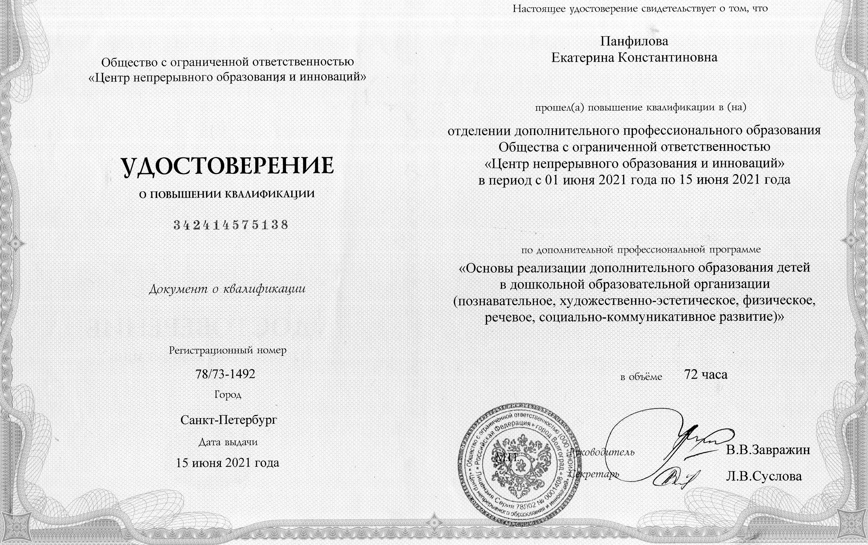 2021г. (72 ч) "Основы реализации дополнительного образования детей в дошкольной образовательной организации (познавательное, художественно-эстетическое, физическое, речевое, социально-коммуникативное развитие)" |
