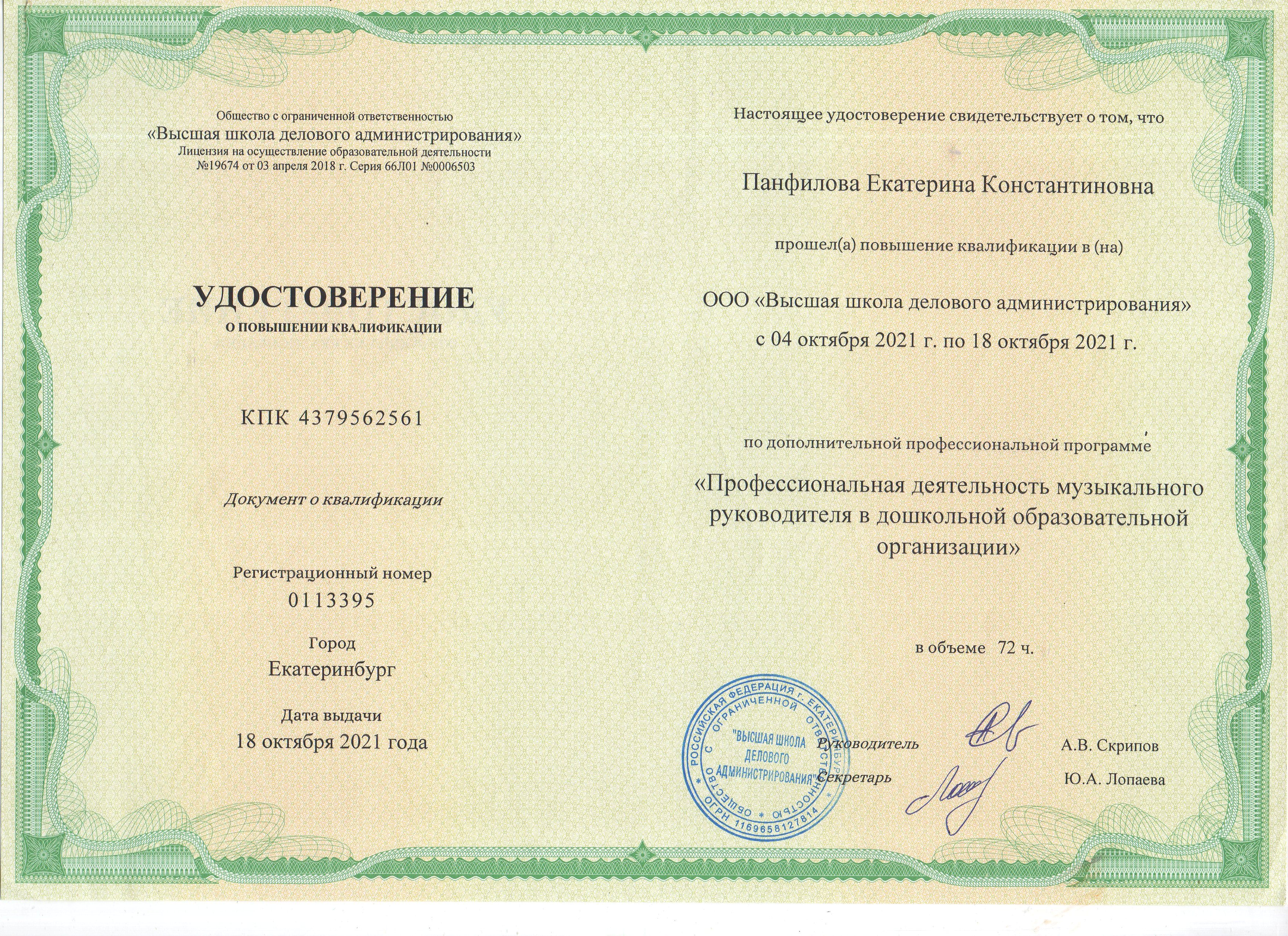 2021г. (72 ч) "Профессиональная деятельность музыкального руководителя в дошкольной образовательной организации"" |