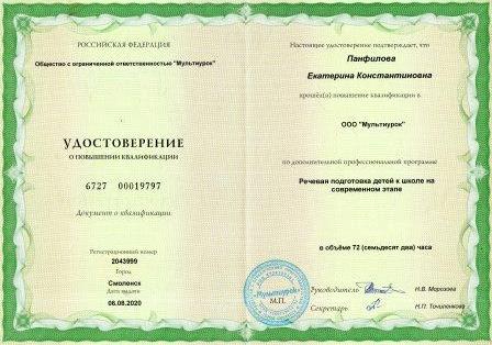 2020г. (72 ч) "Речевая подготовка детей к школе на современном этапе" |
