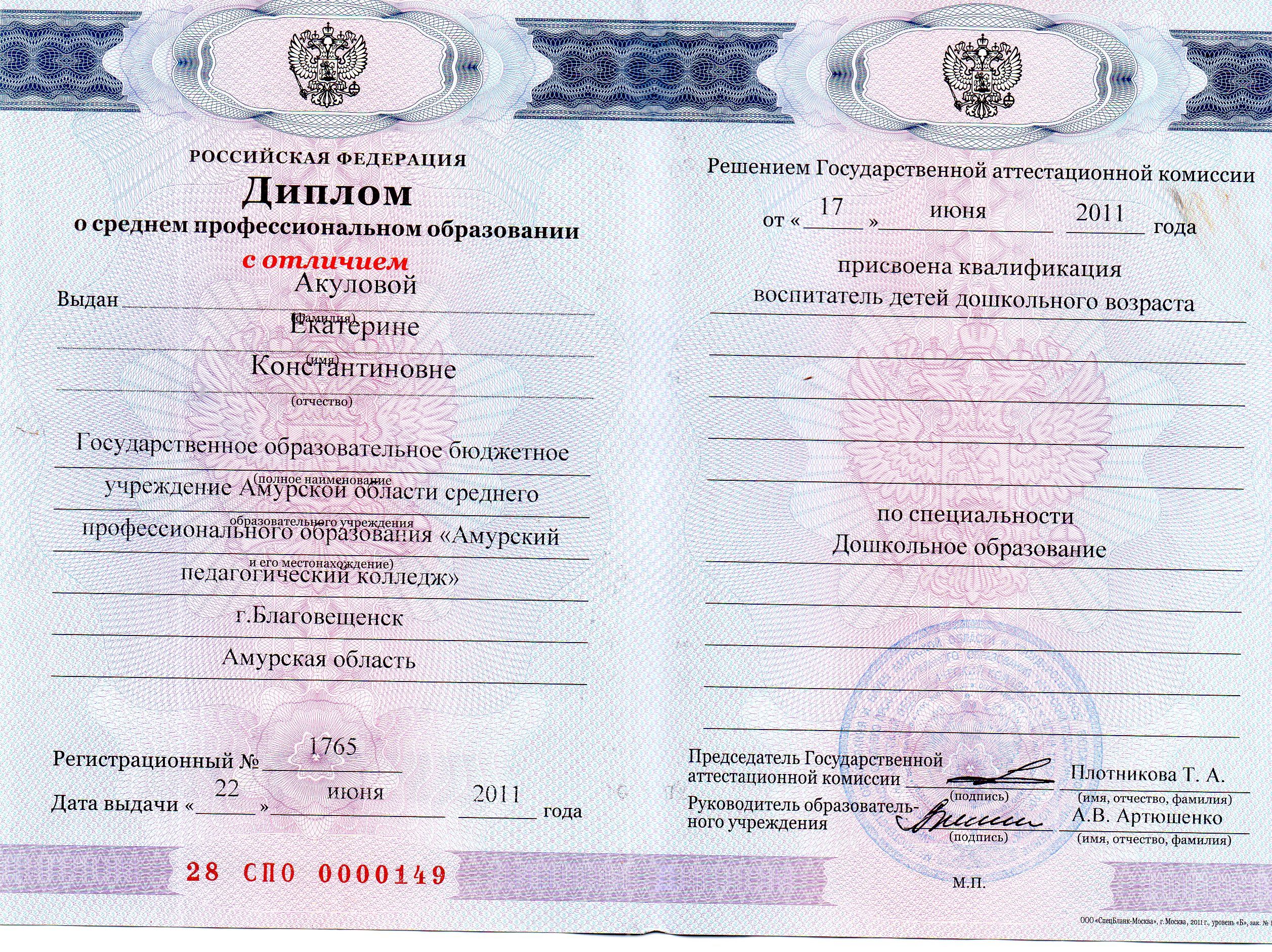Среднее специальное ГОБУ СПО «Амурский педагогический колледж» воспитатель детей дошкольного возраста |