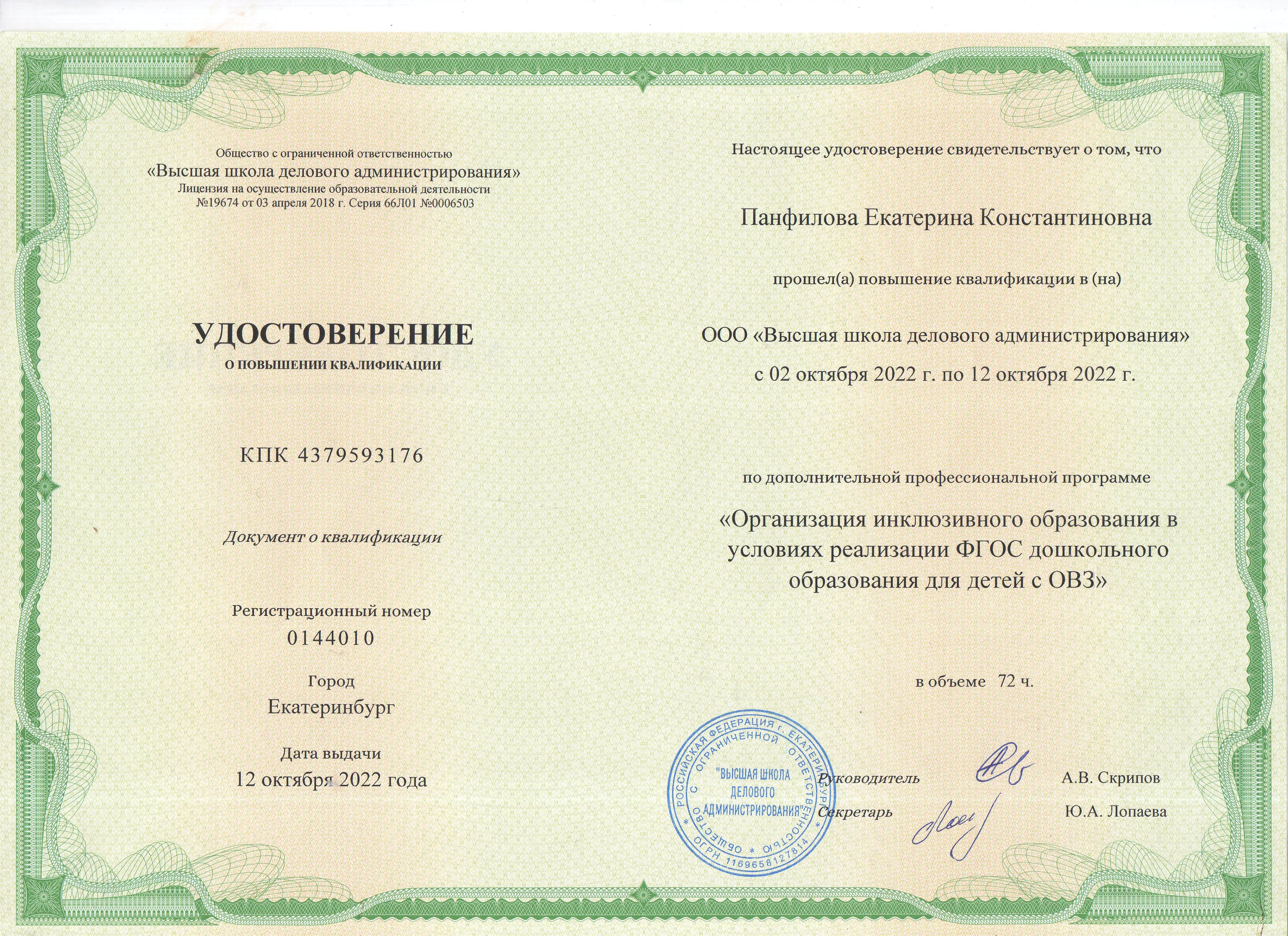 2022г. (72 ч) "Организация инклюзивного образования в условиях реализации ФГОС дошкольного образования для детей с ОВЗ"" |