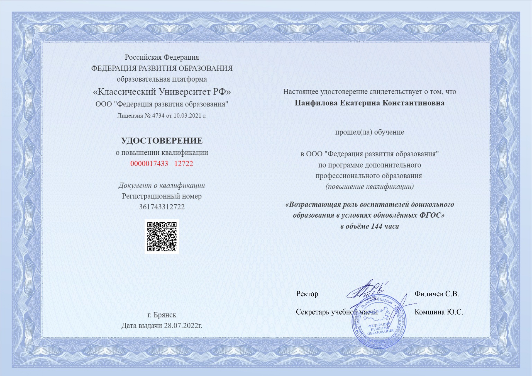 2022г. (144 ч) "Возрастающая роль воспитателей дошкольного образования в условиях обновлённых ФГОС" |
